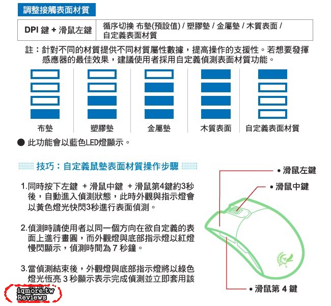 ▲ 關於 Ducky Secret M Optical 的鼠墊表面偵測切換,以及自定義鼠墊最佳化操作說明圖。