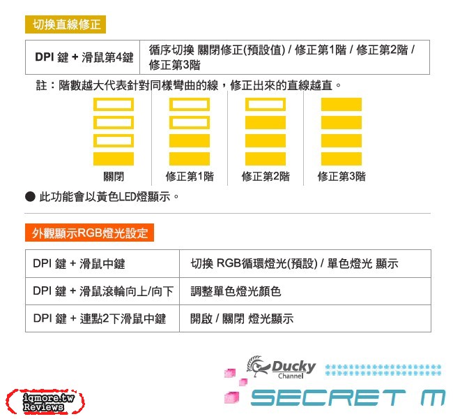 ▲ 關於 Ducky Secret M Optical 的直線修正功能,以及RGB顏色切換操作說明圖。