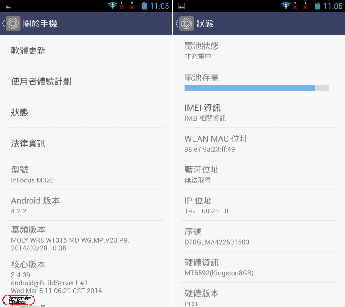 InFocus M320 的「關於手機」狀況,系統採用Android 4.2.2,使用MTK MT6592 八核心處理器。