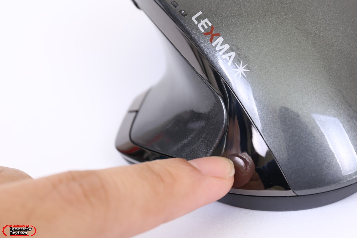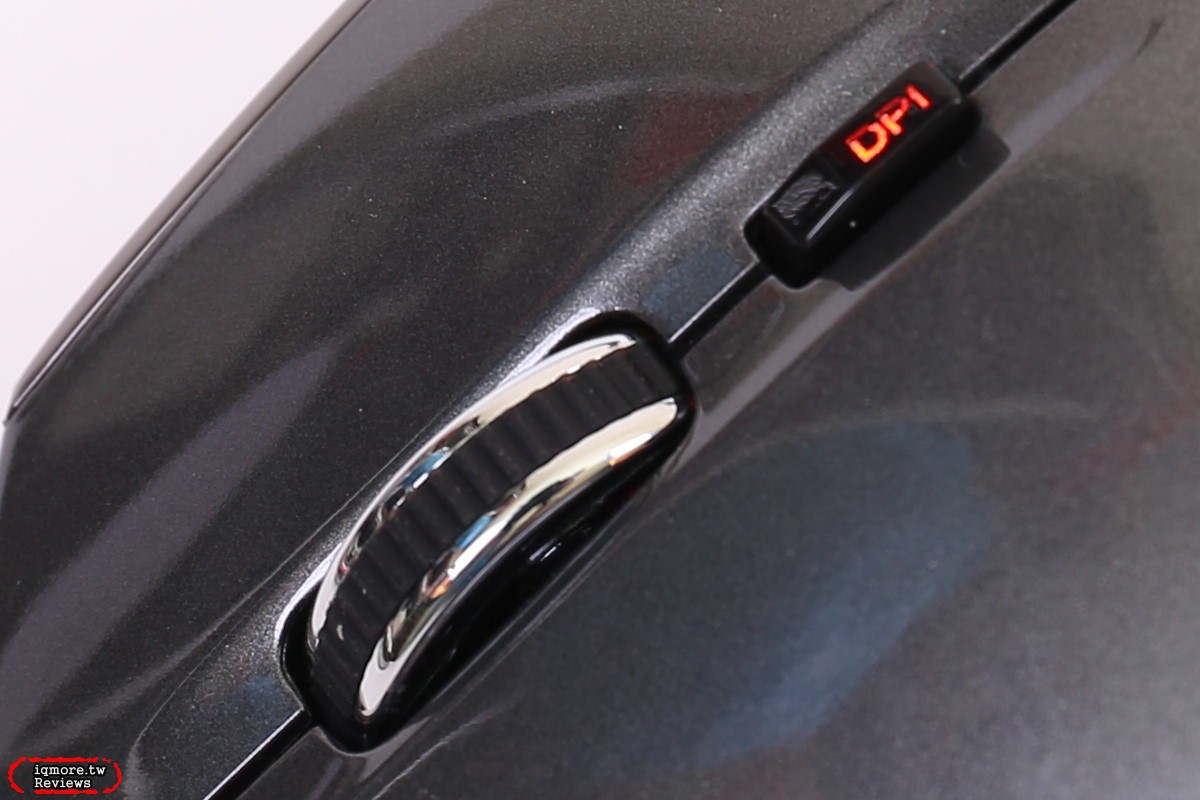 LEXMA M850R 的滾輪旁邊有DPI切換鍵,分別可切換800、1600、2000 DPI,預設為800 DPI。在切換時會以紅燈來顯示,不過是以燈光亮度來區別。但如果覺得燈光不明顯的話,老貓建議直接動動滑鼠試試游標會最快。