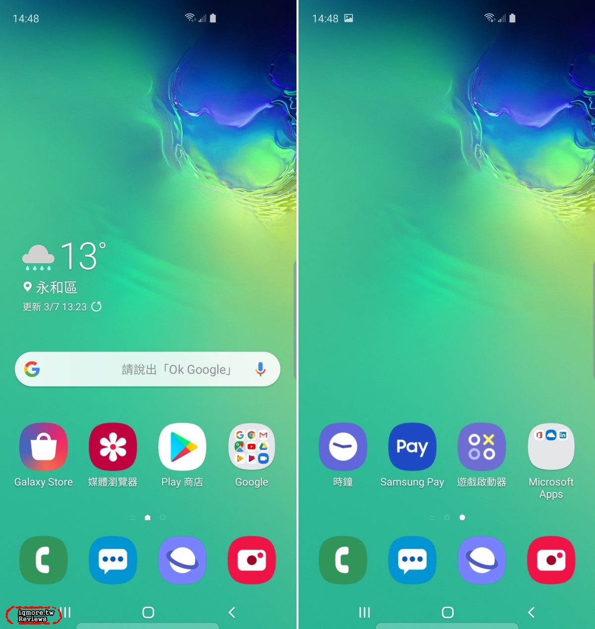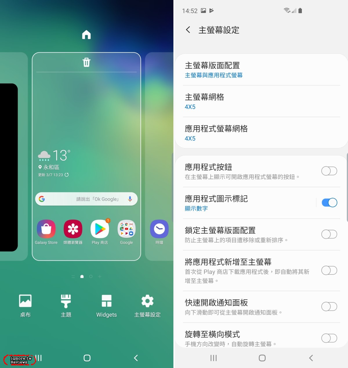 ▼ 在 Samsung Galaxy S10+ 桌面中透過2指斜角往內滑,可以進行主螢幕設定,例如老貓習慣將圖示變小,讓同個頁面中可以塞入更多App。