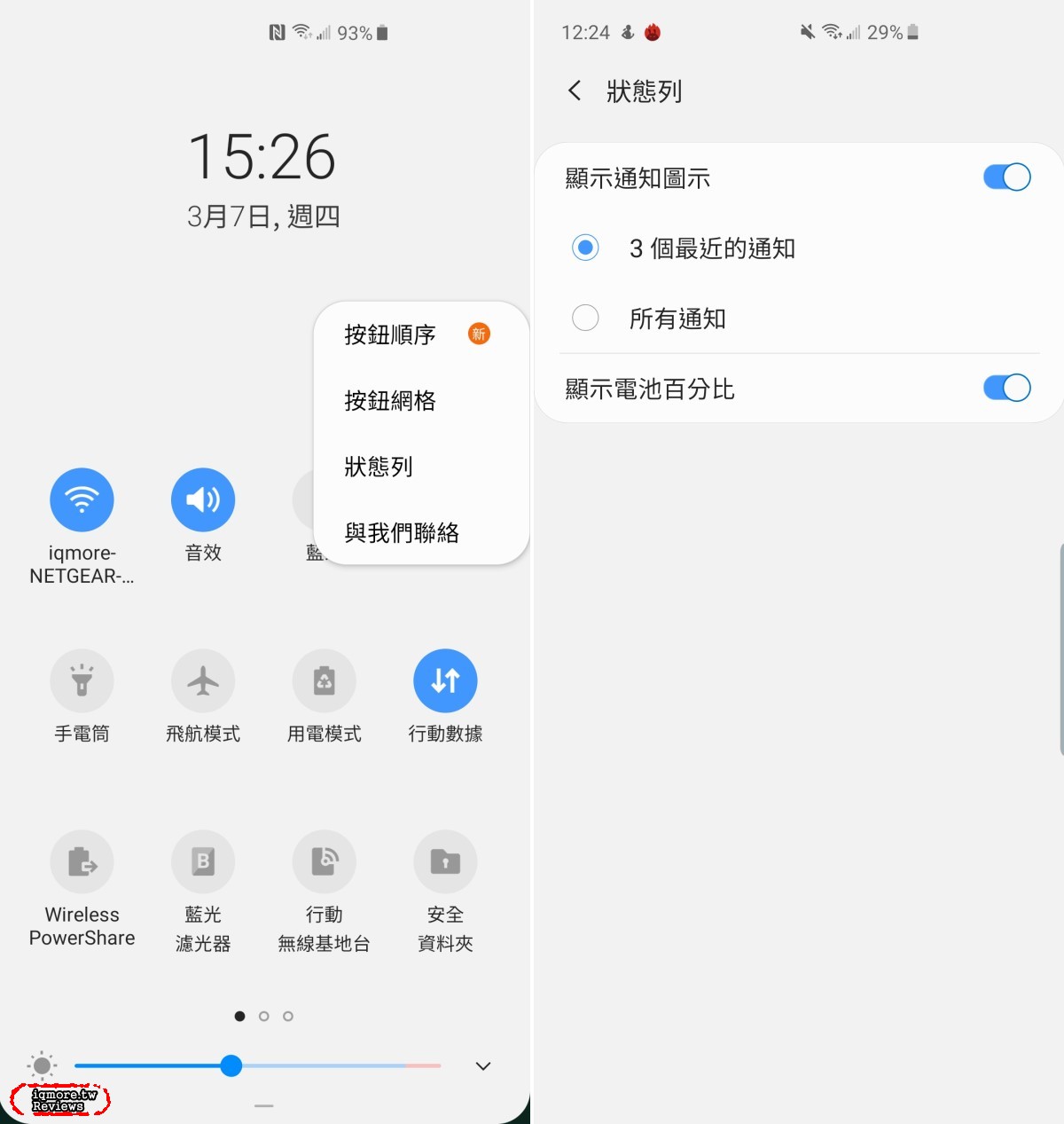 ▼ 這些選單內容都可以進行排序或增減,此外,按下旁邊的狀態列,也能設定通知數量的圖示,以及電池是否要顯示電池百分比。