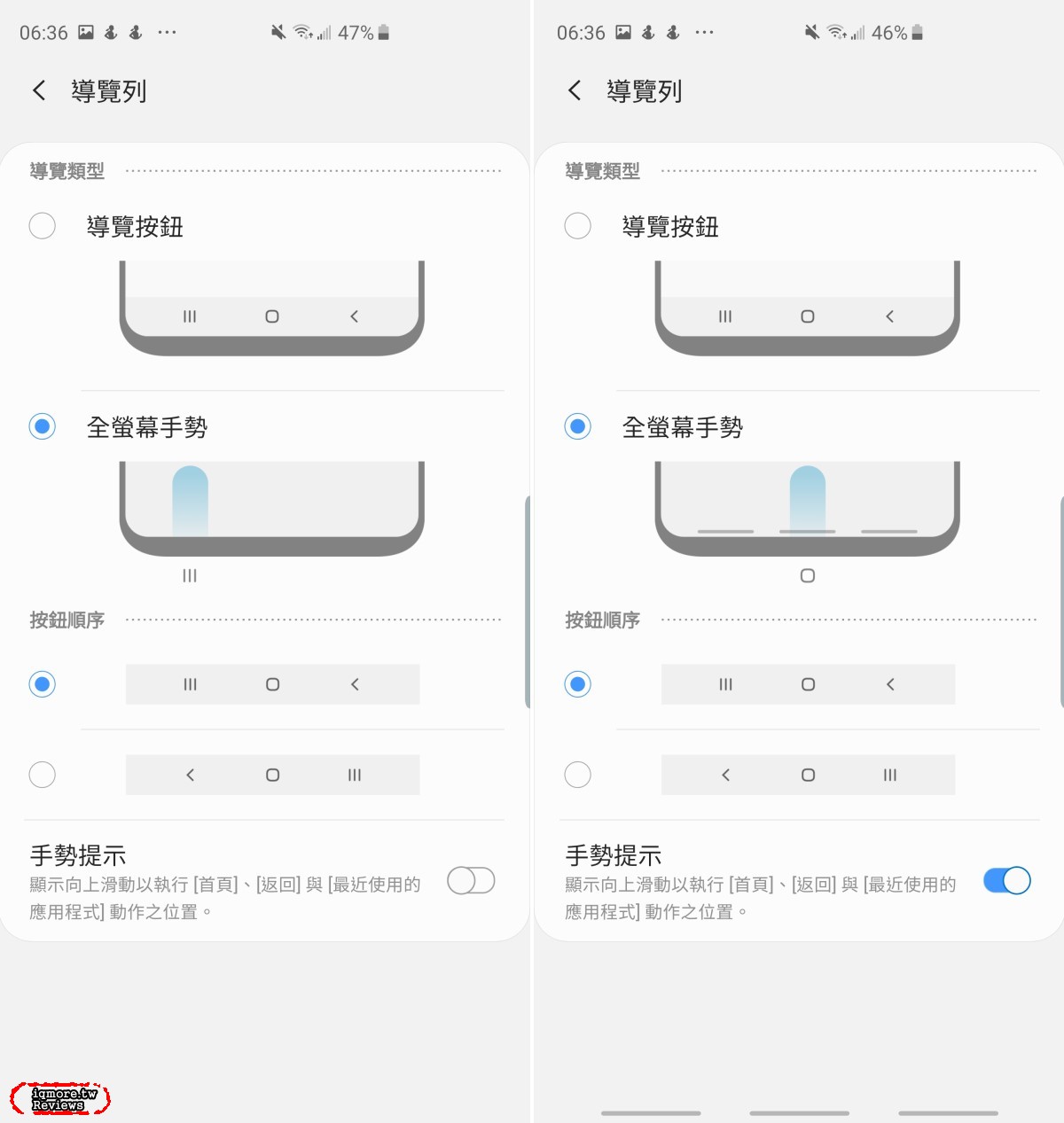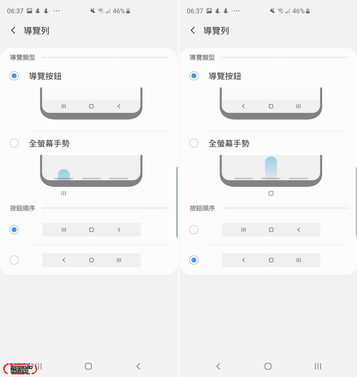 ▼ Samsung Galaxy S10+ 在導覽列的設定中,提供2種的操作方式,分別為「導覽按鈕」、「全螢幕手勢」,預設為「導覽按鈕」。