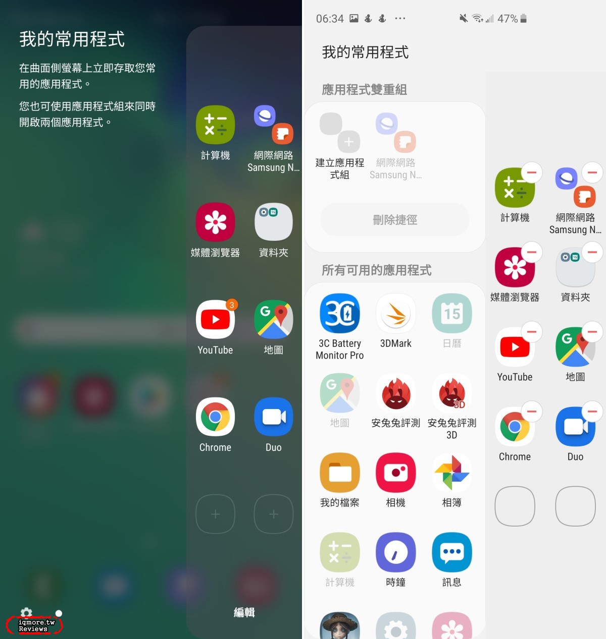 ▼ Samsung Galaxy S10+ 在曲面側螢幕上可以放入一些常用的App,之後只要用手輕輕一滑就能立即點選執行。對於「我的程用程式」外,還有提供許多種曲面側螢幕的應用功能,都可以隨使用者的喜好選擇安裝。