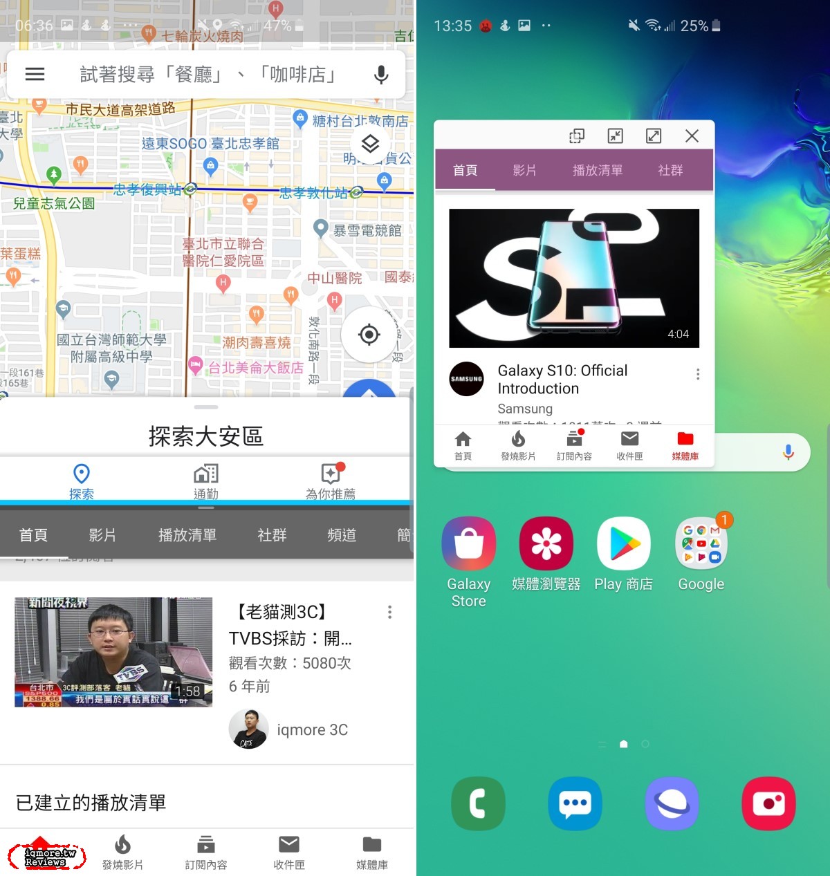 ▼ Samsung Galaxy S10+ 可以進行視窗分割顯示,讓螢幕同時顯然2個App內容,其他還有彈出式視窗顯示,這些好用的功能都有支援。