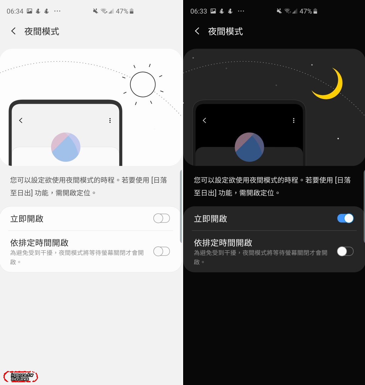 ▼ Samsung Galaxy S10 提供的夜間模式,在晚上昏暗打開手機頁面時,不會覺得光線太過於刺眼。