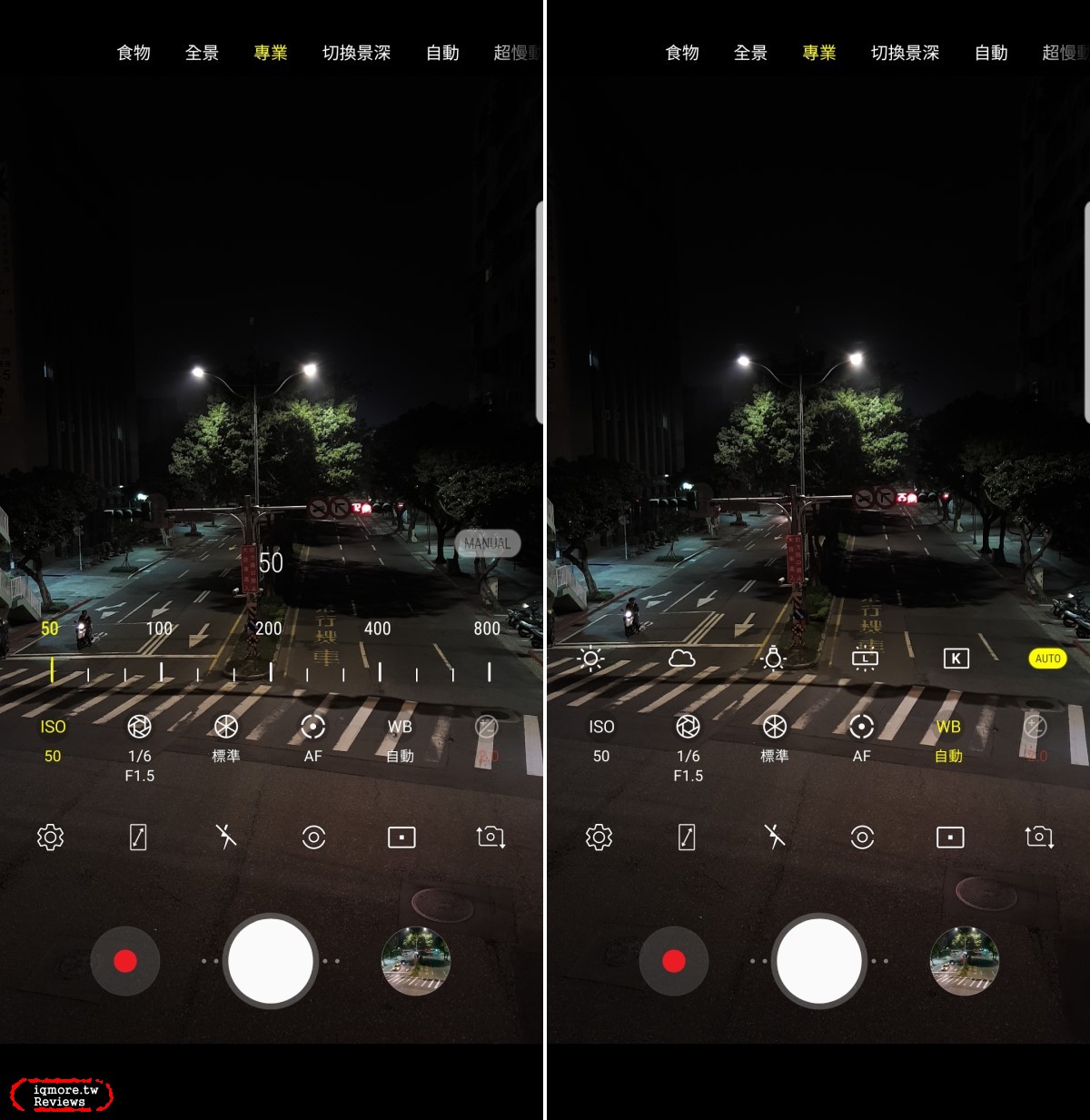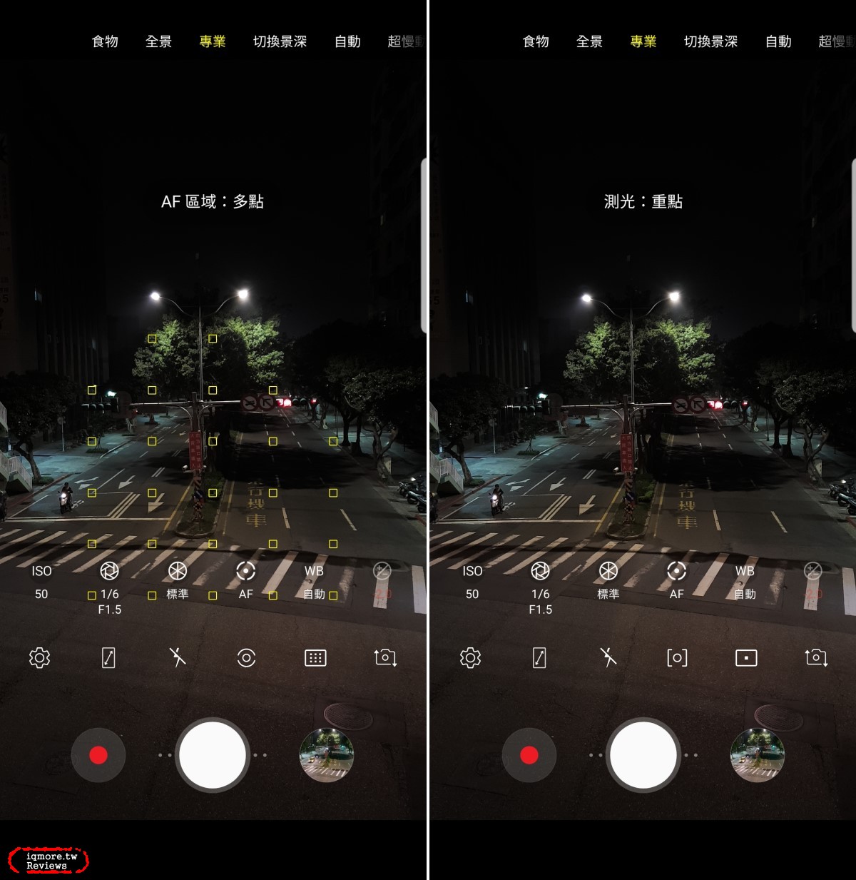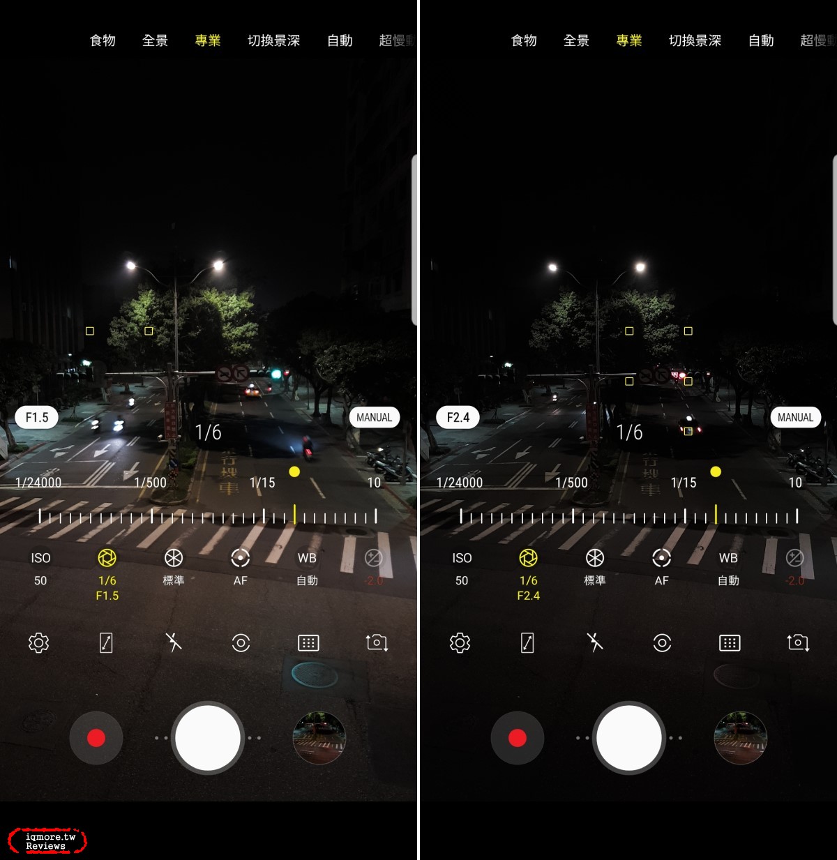 ▼ 關於光圈方面來說,若想要手動切換的話必須要切換成「專業」模式,在此模式下可以調整ISO、光圈、快門、白平衡、焦段、測光、AF區域等。在光圈快門模式下,左側有寫F1.5或F2.4,只要輕輕點選此處就能即時切換光圈。以此圖來說,在同樣1/6秒的情形下,可以看到F1.5大光圈的亮度明顯比F2.4明亮上許多。